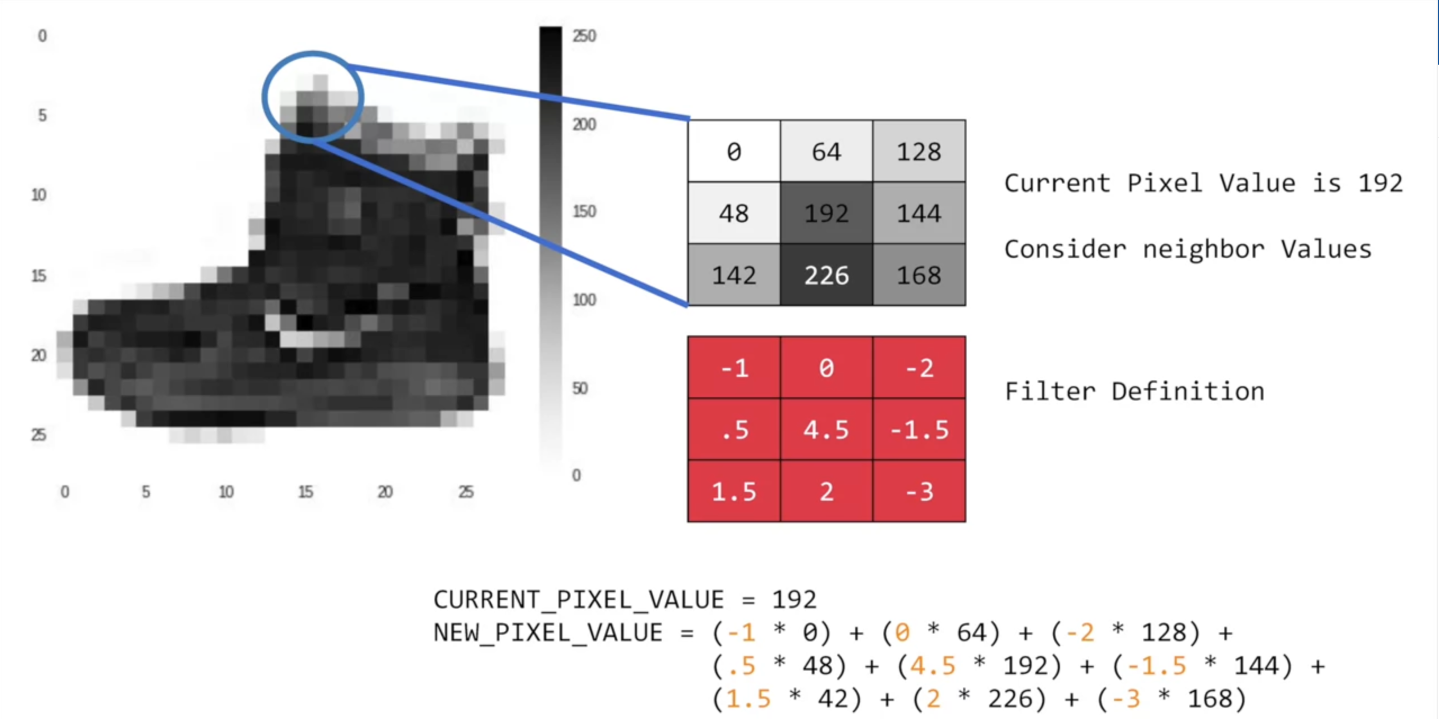 계산은 위와 같이 할 수 있다. Fashion-MNIST 데이터 셋중 신발의 예시로 필터가 적용되는 살펴보자. 파란색으로 동그라미 쳐진부분에서 3x3 픽셀만 살펴보면 해당 부분과 필터와 1:1 매칭으로 곱하기를 걸쳐서 새로운 이미지 값을 뽑아낸다.