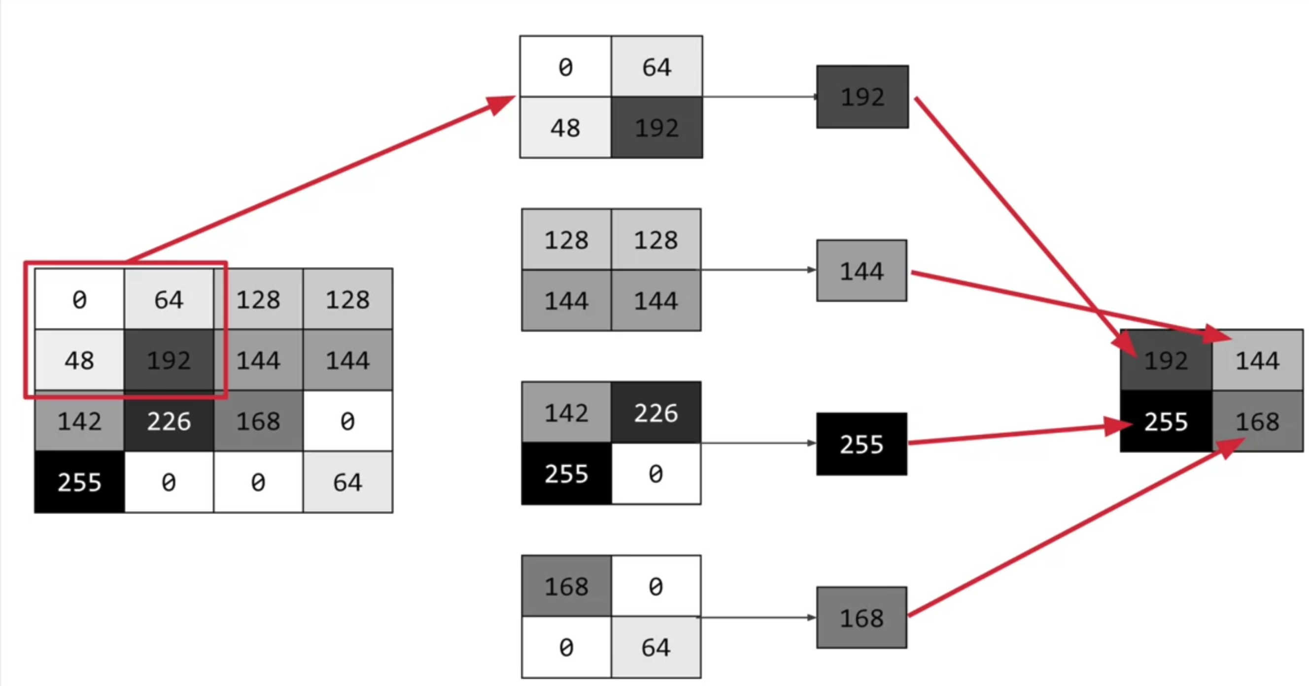 위의 예시는 4x4를 2x2로 이미지를 압축시키는 풀링과정에 대한 예시로 볼 수 있다.