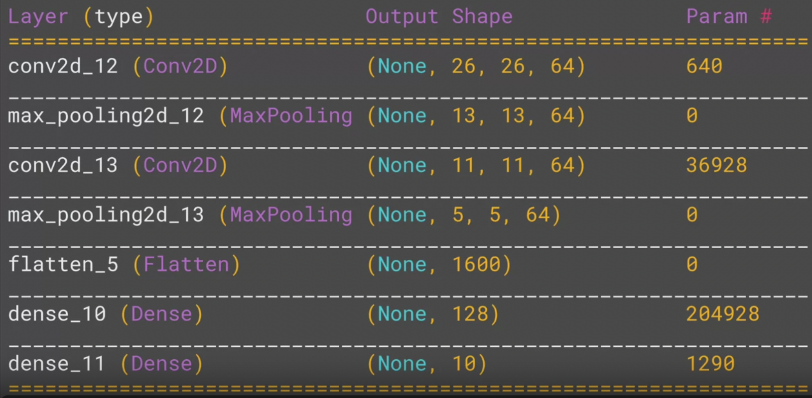 - Line 06: 이제 Flatten으로 펴지게 되는데 이거는 MaxPoolling을 통해서 1/4 그리고 1/4가 된다.